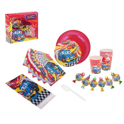 856620 Набор бумажной посуды "Праздник чемпиона" на 6 персон: скатерть, салфетки, стаканы и т.д.
