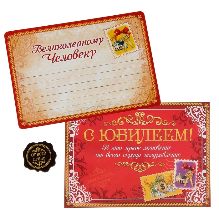 крепление с пожеланием, декорированное под сургуч, на конверте.